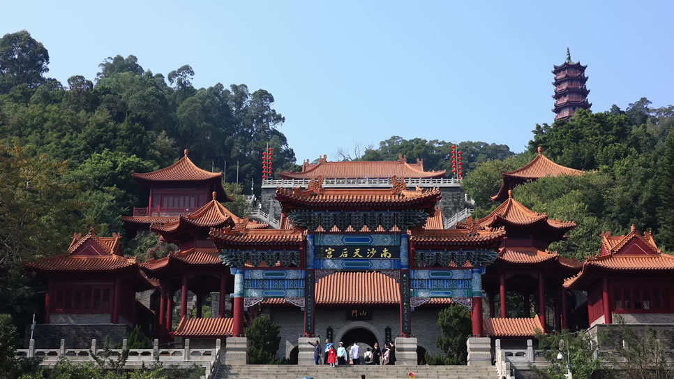 廣州南沙天后宮,又叫“媽祖廟”,位于廣東省廣州市南沙區天后路88號,坐落于大角山東南麓,地處粵港澳大灣區之心,瀕臨珠江出海口的伶仃洋,占地面積達18萬平方米。廣州南沙天后宮前身是明代建于鹿頸村的天妃古廟,清乾隆年間經重修定名為元君古廟,抗戰時期被日寇飛機炸毀,而后于1994年重建。廣州南沙天后宮是為紀念海上女神林默而建,是一個以媽祖文化為主題的景區,是粵港澳大灣區媽祖文化交流中心,亦是東南亞最大之媽祖廟。廣州南沙天后宮采用清式建筑對稱布局,高低錯落地依山而建,建筑的特點集北京故宮的風格和南京中山陵的氣勢于一體,規模為現今世界同類建筑之最。廣州南沙天后宮由廣場、宮殿和南嶺塔三部分構成,“天后八景”包括:濱海銀灘朝陽、五彩靈徑、媽祖靈釵、“南沙人”遺址、靈宮賜福、南嶺夕照、抗戰神炮、默娘之家八個景點。