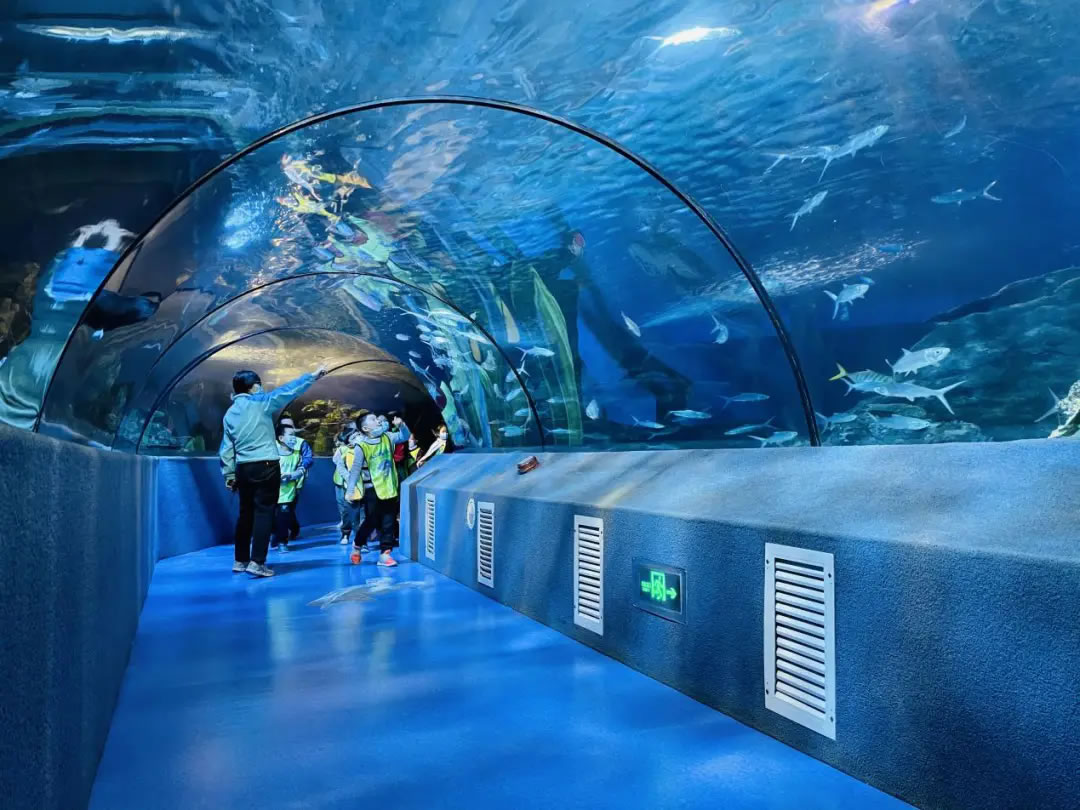 - 海底隧道:80米長、270度亞克力玻璃環繞,鯊魚、鰩魚從頭頂掠過,搭配丁達爾效應光影,形成震撼視覺體驗。