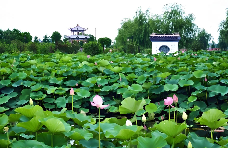- 藕池文化園:核心賞荷區(qū),種植120余種荷花,夏季荷花盛放時形成壯麗景觀,曾現(xiàn)罕見并蒂蓮,設(shè)有8米高“荷花仙子”雕塑及觀景亭。