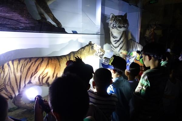 孩子們在國家動物博物館熄燈環境里用手電筒照明,觀察孟加拉虎和東北虎標本。受訪者供圖