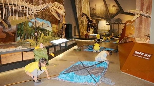為應對夜場活動數量多、而館內工作人員有限的情況,博物館引入專業研學團隊負責夜宿活動的策劃與執行。30組親子家庭在破冰活動后,跟隨專業講解員走進展廳,深入了解脊椎動物的演化歷程;體驗4D電影和化石盲盒等手工制作;最后,在博物館鎮館之寶——長達26米的馬門溪龍骨架化石下搭起帳篷,伴著生動的睡前故事進入夢鄉。