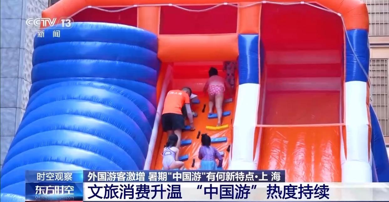 “清涼經濟”也是這個夏天的熱門打開方式。7月以來,上海外灘搬來了一座暑期限定的水上樂園,帶領市民游客開啟玩水模式。打水仗、蕩秋千、爬索道,每個角落都藏著意想不到的清涼驚喜。