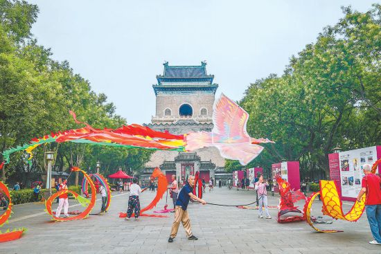古老的鐘樓前,市民舞動龍鳳彩帶健身休閑,傳統韻味與現代活力在此交融。 本報記者 武亦彬攝