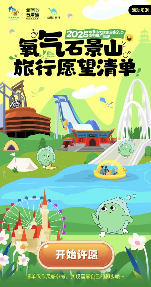 在“去哪兒”旅行APP上線“氧氣石景山”文旅專題頁,不僅整合酒店榜單、景區(qū)門票、優(yōu)質攻略等核心文旅資源,更特別設置石景山區(qū)對口支援和協(xié)作地文旅產(chǎn)品版塊,實現(xiàn)“石景山推廣+支援地區(qū)助銷”雙重價值。同步推出的“旅行打卡愿望清單”H5,線上用戶可點亮自己的石景山旅游心愿,生成專屬旅行愿望清單;在高校路演活動中,大學生可分享H5到社交媒體作為參與活動的入場券——既為高校活動預熱,更成為高校路演入場憑證,串聯(lián)起“線上互動-線下參與”的閉環(huán)。