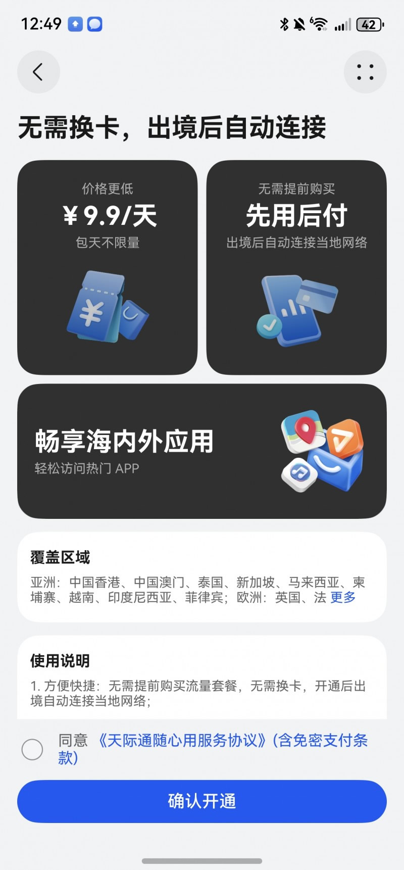 緊接著,天際通第二重禮·隨心用——9.9元/天多地流量隨心用,針對多地旅行或深度游用戶,天際通推出「9.9元/天多地流量隨心用」服務,用戶無需換卡,支持先用后付,按需付費。每24小時僅需9.9元,享5GB高速流量+常速不限量,覆蓋歐美、東南亞等50個熱門地區;單次開通長期有效,不用不扣費,聯程轉機無縫銜接。