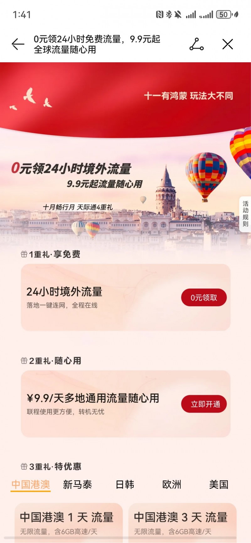 國慶長假將至,出境游熱度飆升,9月17日至10月31日,華為天際通「十月暢行月」福利活動開啟,推出4重超值禮遇,從免費流量、按天計費到本地權益全覆蓋,讓用戶真正實現說走就走,暢行無憂。
