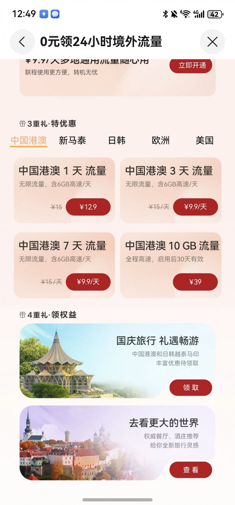 此外,天際通第三重禮·特優惠——大流量特惠,多人共享,國慶期間,天際通同時上線特惠流量套餐包,提供按天付費和按流量付費多種套餐,適用于中國香港&澳門、新馬泰、日韓等高頻目的地,即買即用;支持中國香港&澳門、新馬泰、日韓、歐洲、美國等地的共享10GB大流量包,熱點共享,全家出行或結伴旅游無需頻繁續費,大容量流量一次囤夠。