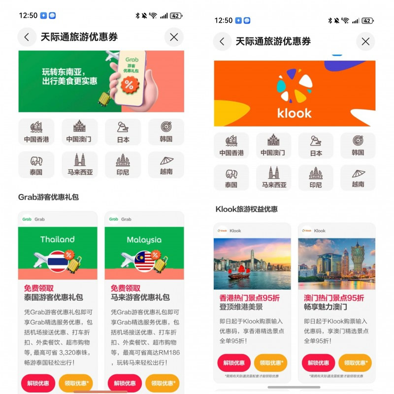 天際通「十月暢行月」第四重禮·領權益,天際通聯合全球合作伙伴,為用戶提供超值旅游權益包,覆蓋Grab打車、Klook景點門票、酒店餐飲等場景,在馬來西亞、泰國、歐洲等地均可享受出境專屬折扣。
