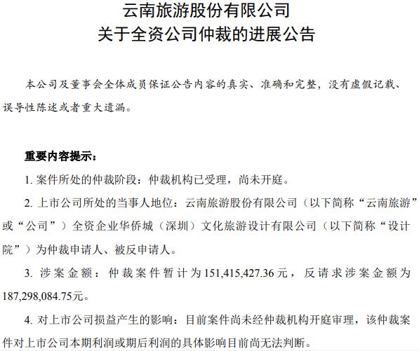 公司在今年2月發布公告,海力控股集團有限公司與公司的全資公司云南旅游汽車有限公司所屬全資公司云南云旅交通投資開發有限公司發生合同履行糾紛,海力控股就該合同糾紛向昆明市中級人民法院提起訴訟。因云旅交投認為海力控股存在違約,對案件提起反訴。近日,公司收到昆明中院出具的《民事判決書》,判決由云南云旅交通投資開發有限公司支付海力控股集團有限公司工程款1.18億元及預期利息等。