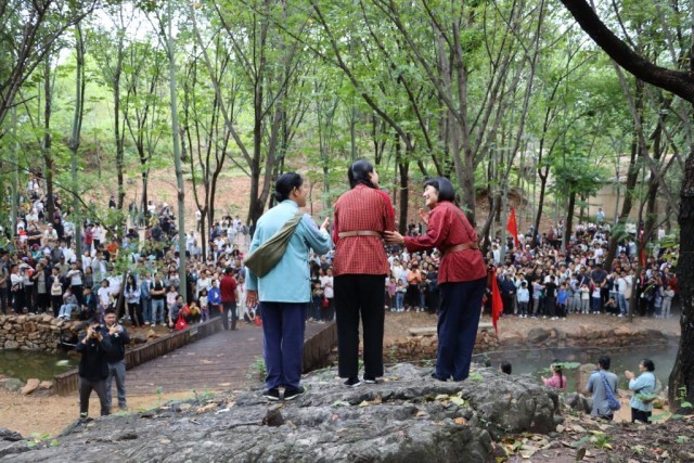 國(guó)慶中秋長(zhǎng)假期間,游客在山東紅嫂家鄉(xiāng)旅游區(qū)觀看演出。新華社發(fā)