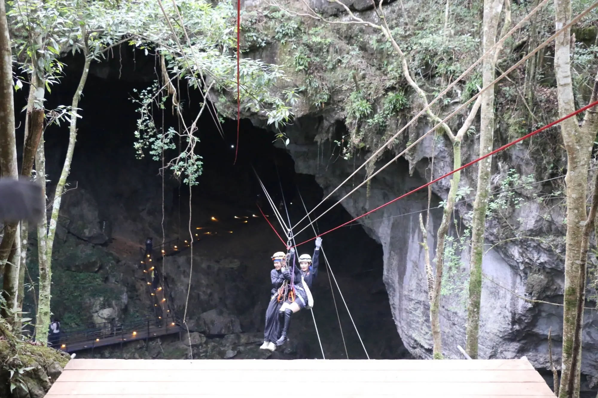 游客體驗洞穴溜索(荔波縣融媒體中心供圖)