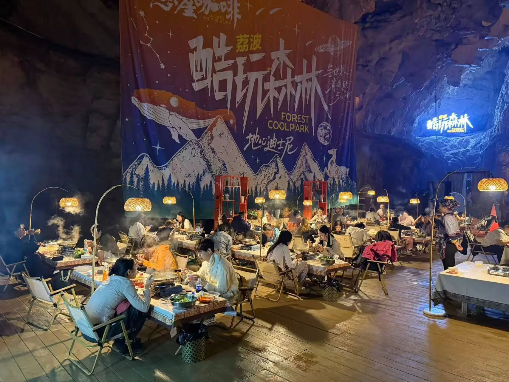 探險之后,在常年保持15攝氏度的洞穴餐廳,吃上一頓熱氣騰騰的火鍋,感受與洞外溫差帶來的獨特體感,成為游客們的特別享受。開闊的洞廳內,數十張餐桌整齊排列,餐桌上方的暖色照明燈既保證了用餐所需的足夠亮度,又完整保留了洞穴的自然氛圍。游客們一邊圍坐火鍋旁大快朵頤,一邊欣賞巖壁上自然形成的奇異紋路,感受這個地下空間獨有的神秘。