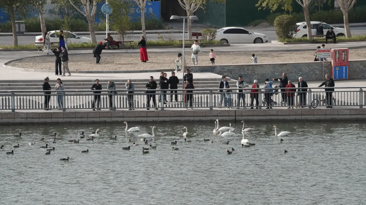 而天鵝們“鐘情”于庫爾勒白皮馕的趣味習性,更是拉近了人與鳥的距離。每當天鵝護衛隊員的哨聲響起,天鵝便會從四面八方聚攏而來,市民游客投喂的馕塊與天鵝歡快的鳴叫聲交織成一曲和諧的城市樂章。這溫馨的日常,是庫爾勒人文溫度與生態文明深度內化的生動體現。