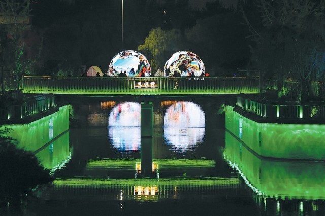 觀瀾橋上,燈光藝術裝置美輪美奐。 本報記者 程功攝