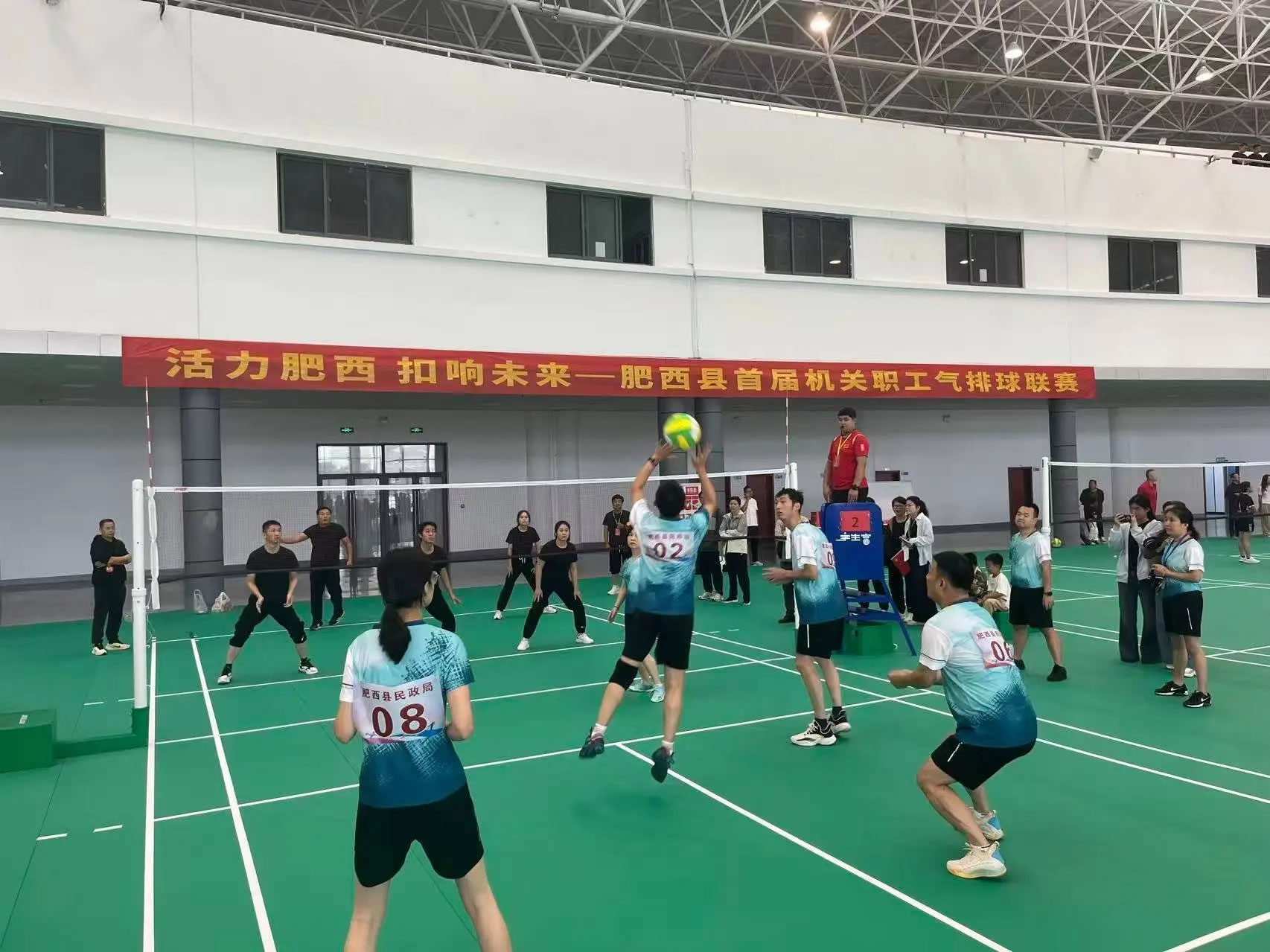 裁判一聲哨響,比賽正式打響。上午8場比賽同時進行,參賽各支隊伍迅速進入狀態,發球、墊球、傳球、扣球、攔網……各個環節都展現出較高的競技水準。賽場邊觀眾的加油聲、歡呼聲此起彼伏,將比賽氣氛不斷推向高潮。