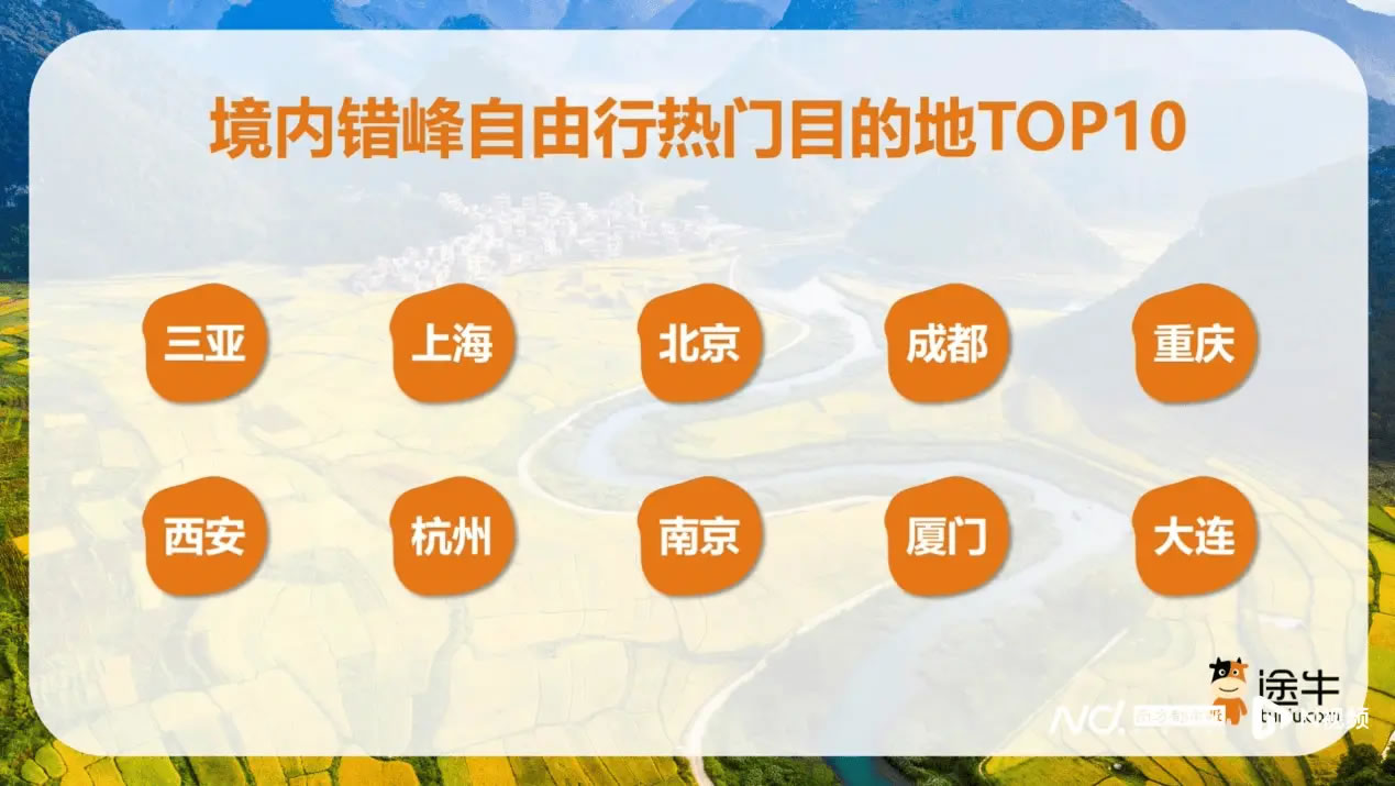 境內錯峰游仍是多數游客的首選,途牛平臺上境內出游人次占比超過70%。熱門目的地包括上海、北京、三亞、成都、廣州、杭州、西安、南京、重慶、黃山等地。