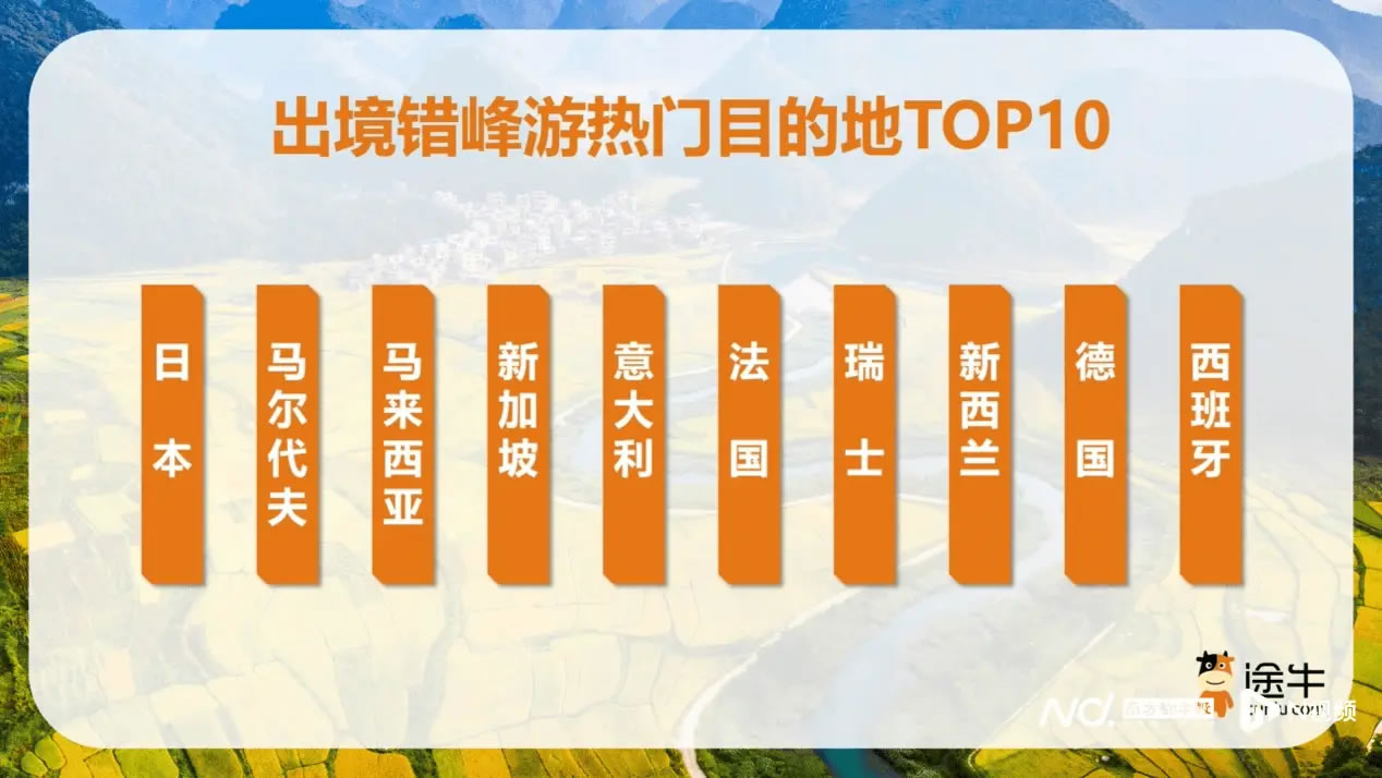 在出境錯峰游中,日本、韓國、泰國、馬來西亞、新加坡等短線目的地,以及意大利、法國、瑞士、新西蘭等長線國家受到關注。途牛數據顯示,出境錯峰游中跟團游占比接近75%,如“德國-法國-意大利-瑞士12日游”“新西蘭南北島12日游”等產品預訂熱度靠前。