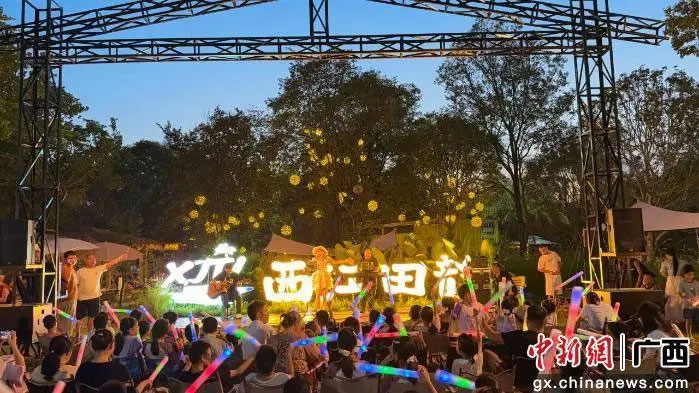 西江田韻休閑營地的草坪音樂會人氣爆棚。每日傍晚,草坪上坐滿游客,主辦方邀請多風格樂隊、歌手現場演出,動感流行曲與舒緩民謠交替響起,旋律在田野間回蕩。游客或鋪野餐墊圍坐,或站在草坪邊緣揮舞熒光棒,隨節奏輕搖,享受獨特音樂盛宴。
