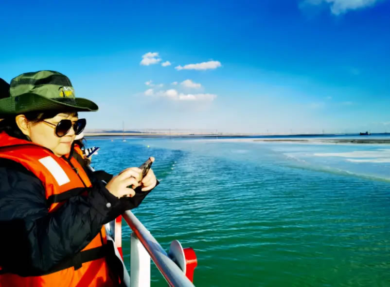 10月14日,由中共海西州委宣傳部主辦、西海都市報社承辦的“紅杞風光別樣美 ”活動,走進海西蒙古族藏族自治州烏蘭縣,研學團隊來到茶卡鹽湖,乘坐游船觀光,湖面上駛來的大型運鹽船讓外省記者及學生不由感嘆:沒想到“天空之鏡”還有另外一種獨特景致。湖面上駛來的大型運鹽船吸引了研學團隊成員的目光。采鹽船正在鹵水中作業,發出低沉的轟鳴,空氣中彌漫著咸潤的氣息。研學的同學通過實地觀察鹵水的蒸發、結晶過程,將課本上的地理、化學知識,與這片壯麗的現實場景融會貫通。