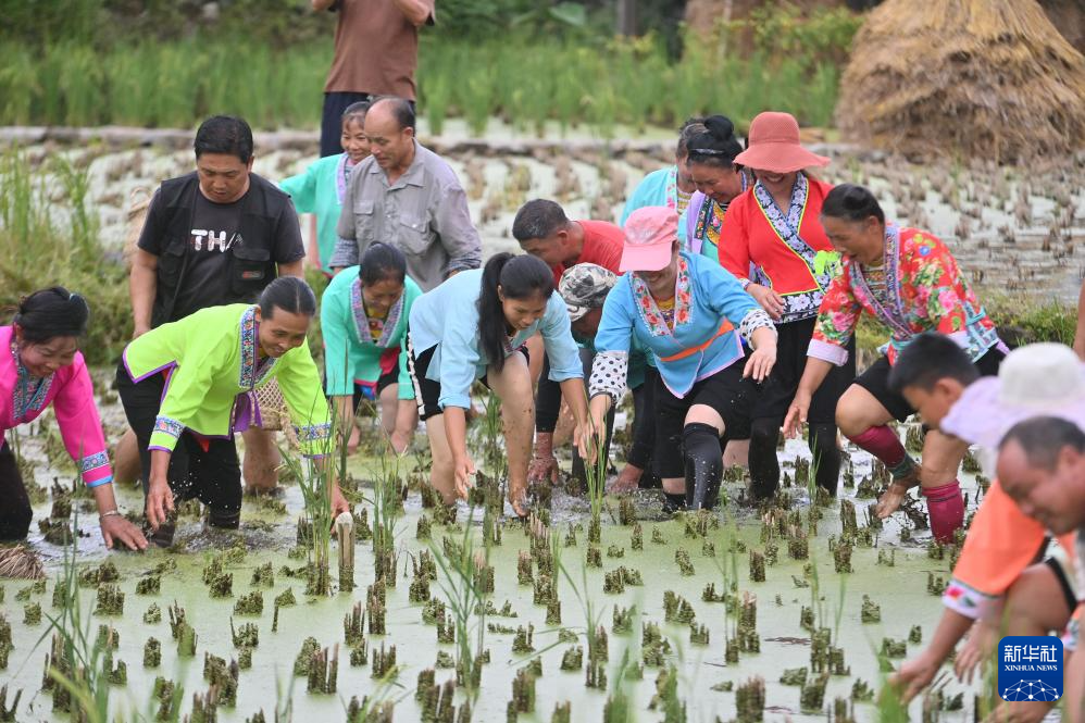10月18日,在柳州市融水苗族自治縣安太鄉培秀村,村民們在稻田里進行抓魚比賽(無人機照片)。