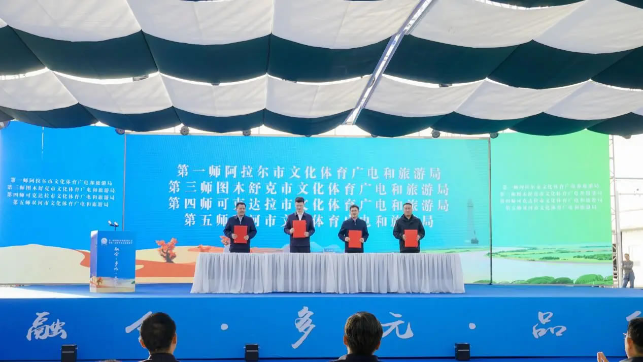 當(dāng)天,第一師阿拉爾市旅游發(fā)展大會暨第三屆塔里木文化旅游節(jié)文旅客商推介會同步舉辦。第一師阿拉爾市文化體育廣電和旅游局分別與第三師圖木舒克市、第四師可克達(dá)拉市、第五師雙河市的文化體育廣電和旅游局簽署合作共建協(xié)議,在旅游產(chǎn)業(yè)領(lǐng)域深化合作,推動區(qū)域文旅協(xié)同發(fā)展。第一師阿拉爾市文化體育廣電和旅游局、塔里木文旅集團(tuán),以及第一師四團(tuán)、七團(tuán)、十六團(tuán)依次登臺,重點推介了涵蓋沙漠探險、生態(tài)觀光、民俗體驗等多個領(lǐng)域的文旅項目。