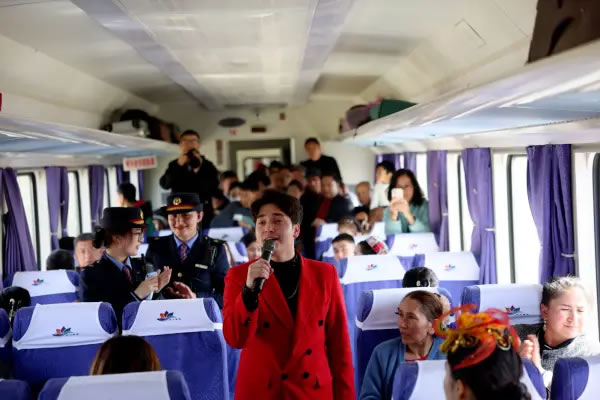 火車上,《和田是個好地方》《新疆姑娘》《祝福祖國亞克西》等經典文藝節目輪番上演,悠揚的旋律和深情的演唱打動著在場的每一位旅客,讓車廂成為流動的舞臺。文藝表演結束后,文旅資源宣傳推介環節緊隨其后,工作人員通過生動講解與展示,帶領旅客提前領略和田的獨特風光與人文魅力。此外,宣講人員還用接地氣的家常話、互動感十足的小問答,把理論知識講得鮮活有趣,讓旅客們在旅途的碎片時光里,既能放松休憩,又能輕松收獲思想啟迪,讓出行多了一份別樣的“精神補給”。