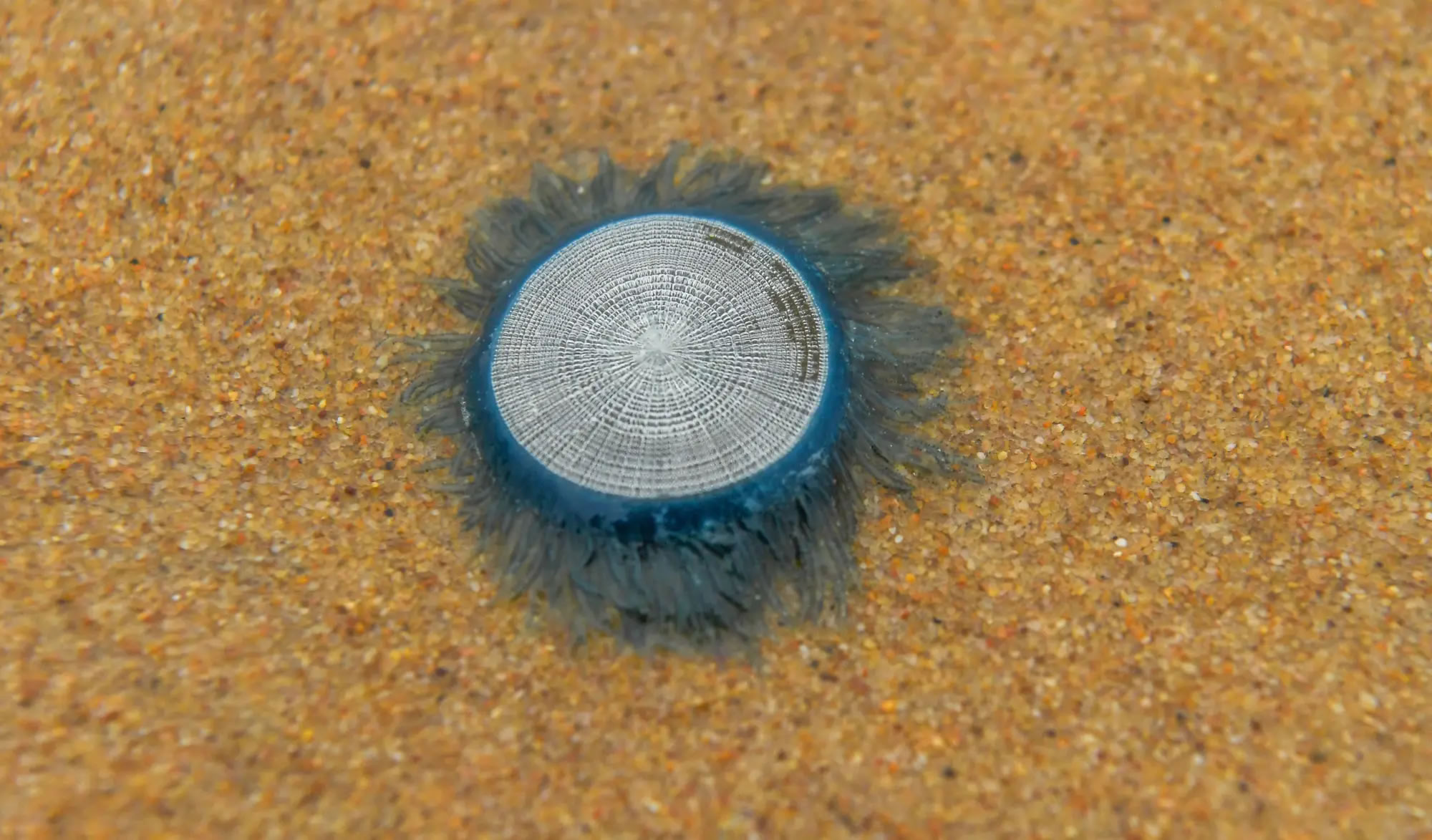 經(jīng)海口市資規(guī)局聯(lián)同海南省海洋監(jiān)測(cè)預(yù)報(bào)中心專家取樣鑒定,這些圓形藍(lán)色生物為銀幣水母,其浮囊體硬而透明,質(zhì)輕呈圓盤狀,觸手上有刺絲囊,毒性相對(duì)較弱。該物種自身無(wú)游泳能力,其移動(dòng)完全依賴海流驅(qū)動(dòng),本次銀幣水母上岸原因,或是受臺(tái)風(fēng)“風(fēng)神”影響,被強(qiáng)風(fēng)和大浪推上海岸。