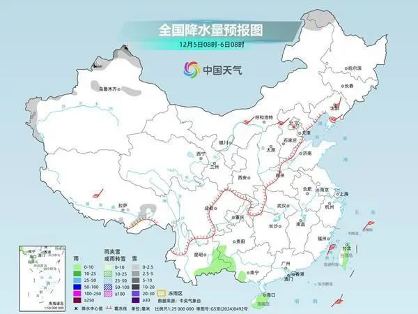 明天,內蒙古東北部、黑龍江西北部、新疆北疆北部和南疆西部山區、西藏東南部等地部分地區有小到中雪或雨夾雪。其中,新疆北疆北部局地有大雪或暴雪;貴州西南部、云南東部、廣西西部、海南島大部、臺灣島東部等地部分地區有小雨。