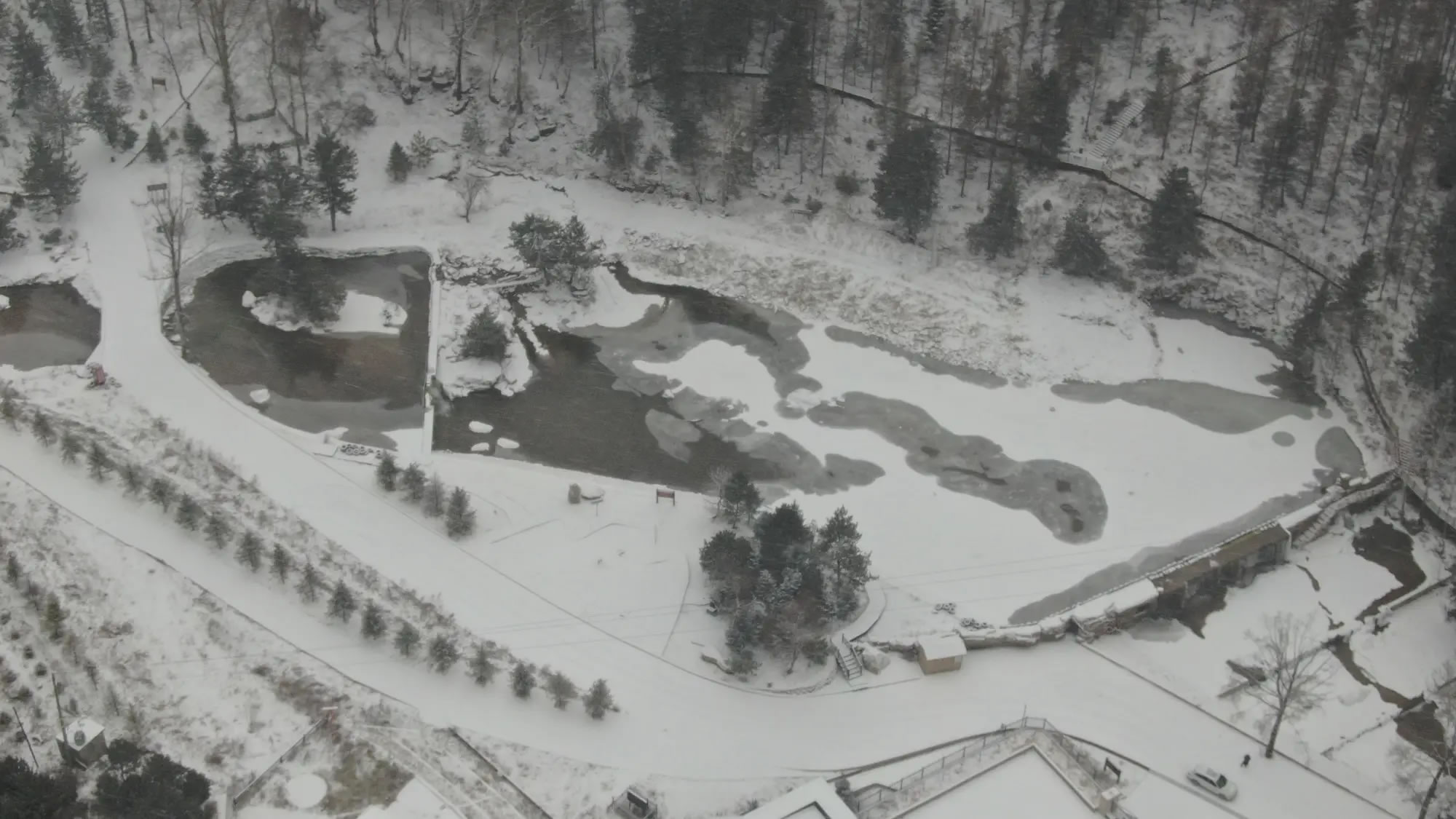 溪流與瀑布是雪中最靈動的景致。十里清溪在皚皚白雪間蜿蜒,水面蒸騰的薄霧與雪氣交融,讓溪流似隱似現,宛如銀綢纏繞山間。小型瀑布部分凝結成冰,晶瑩的冰掛與流動的溪水相映成趣,水珠滴落時濺起的水花沾在石上,瞬間凝成冰晶,構成動靜結合的畫面。溪邊的苔石被積雪覆蓋,只露出邊緣的青黑,與白雪形成強烈對比。