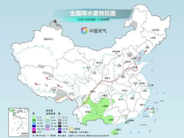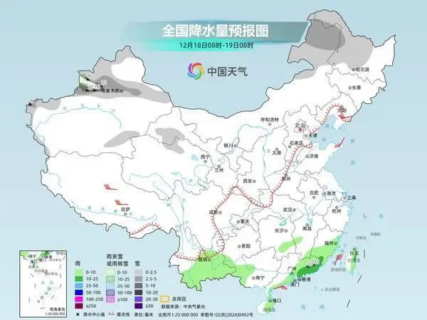 后天,內蒙古東北部、黑龍江中北部、新疆北部和南疆西部山區、甘肅河西等地部分地區有小到中雪或雨夾雪,其中,新疆沿天山地區和伊犁河谷局地有大到暴雪。湖南南部、福建東部和南部、西南地區南部、廣西西南部、廣東東部和南部、海南島東部、臺灣島東部等地部分地區有小到中雨,其中,廣東東部局地有大雨。
