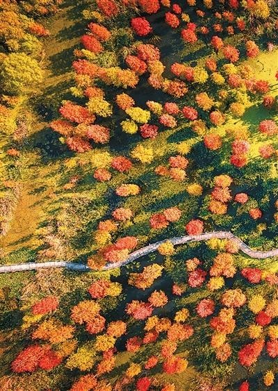 清晨,霧氣氤氳,成片的池杉樹在水中矗立。初冬時節(jié),池杉湖國家濕地公園層林盡染,眾多鳥兒從北方飛回,吸引眾多游客前來觀賞。