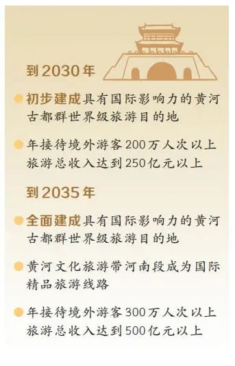 《規劃》設定的雙階段目標,為黃河古都群的發展錨定了清晰航向。到2030年,初步建成具有國際影響力的黃河古都群世界級旅游目的地,年接待境外游客200萬人次以上,旅游總收入達到250億元以上;到2035年,全面建成具有國際影響力的黃河古都群世界級旅游目的地,黃河文化旅游帶河南段成為國際精品旅游線路,年接待境外游客300萬人次以上,旅游總收入達到500億元以上。