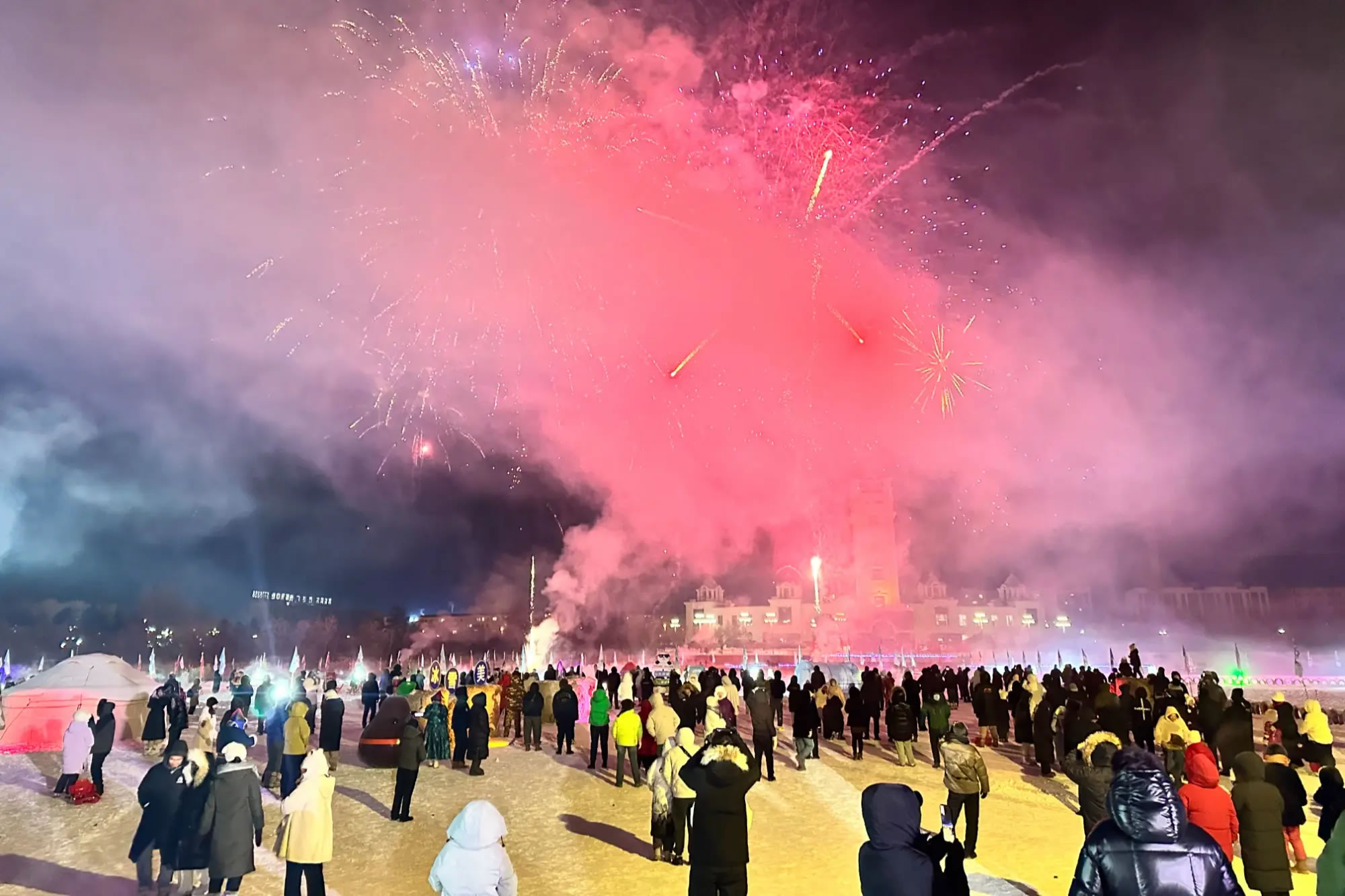 當晚,無人機表演和煙花秀成為開園活動的一大亮點。無人機在夜空中變換造型,與冰雪景觀交相呼應,隨后綻放的煙花點亮夜空,將現場氛圍推向高潮,吸引游客駐足觀看、拍照留念。