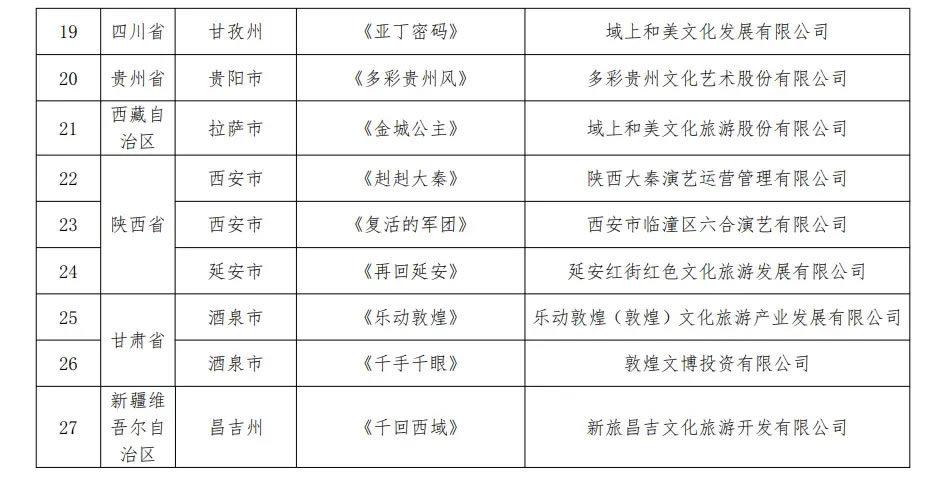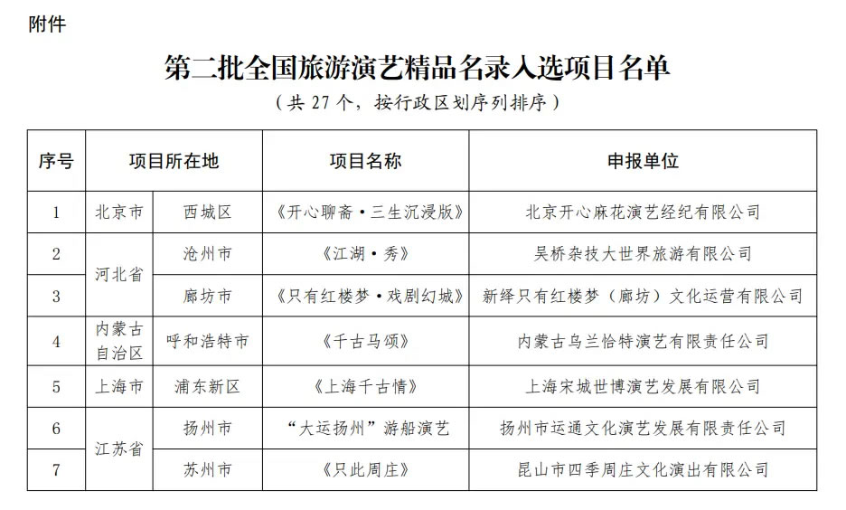 央廣網北京1月16日消息(記者 宋雪)文化和旅游部辦公廳近日發布通知,公布第二批全國旅游演藝精品名錄入選項目名單,《只有紅樓夢·戲劇幻城》《赳赳大秦》《樂動敦煌》等27個項目入選。