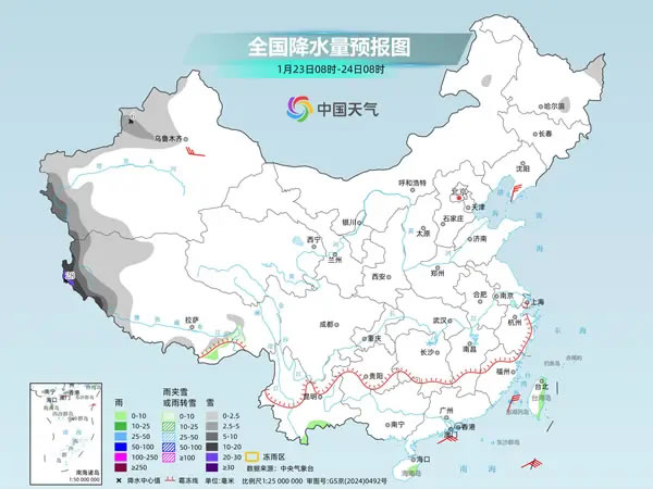 今天,我國雨雪將進一步減少,此次大范圍雨雪過程基本結束,未來三天我國大部地區進入降水間歇期,以晴或多云天氣為主。但與此同時,新疆西部、西藏西部等地將現降雪,局地可能出現大暴雪。