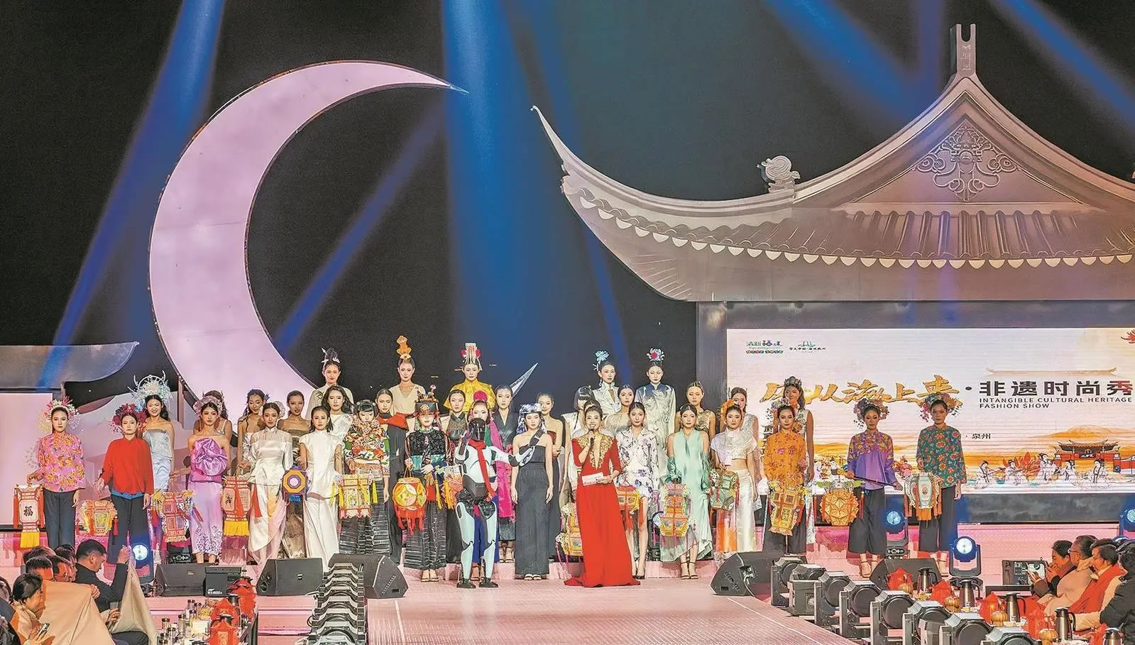 一場以“風從海上來”為主題的非遺時尚秀在蟳埔“宋時明月”舉行;顒由疃热诤纤未缹W與現代時尚,結合泉州夜間經濟業態,為現場300多位嘉賓呈現了一場跨越千年的非遺視覺盛宴。這場約40分鐘的活動,展現了泉州作為世界遺產城市的深厚文化底蘊,也探索了傳統文化在當代的創新表達。