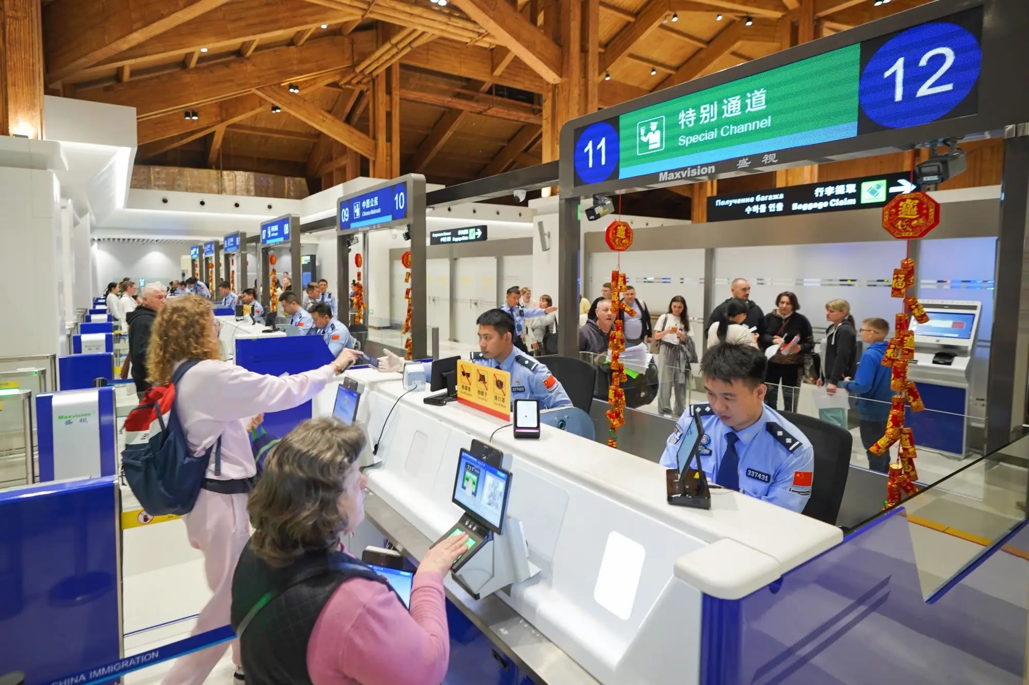 為應對春節假期出入境客流高峰,美蘭、鳳凰出入境邊防檢查站提前發布客流高峰預測,實時監測旅客流量變化,加強現場勤務組織,合理安排執勤警力,提前開足查驗通道,增設現場標識指引,推出24小時直接過境免辦邊防檢查手續、外國人入境卡網上填報、團體旅游簽證網上申辦等系列便利措施,確保中外旅客高效、順暢通關。